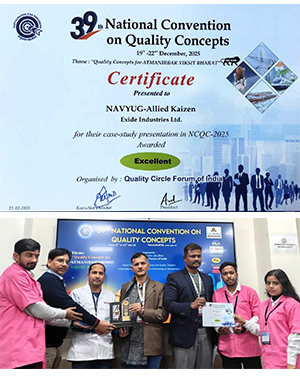 Certificate of Excellence for Exide's case study presentationDecember 21, 2025 Certificate of Excellence for Exide's case study presentation at the 39th National Convention on Quality Concepts, organised by the Quality Circle Forum of India (QCFI), themed "Quality Concepts for Atmanirbhar Viksit Bharat."